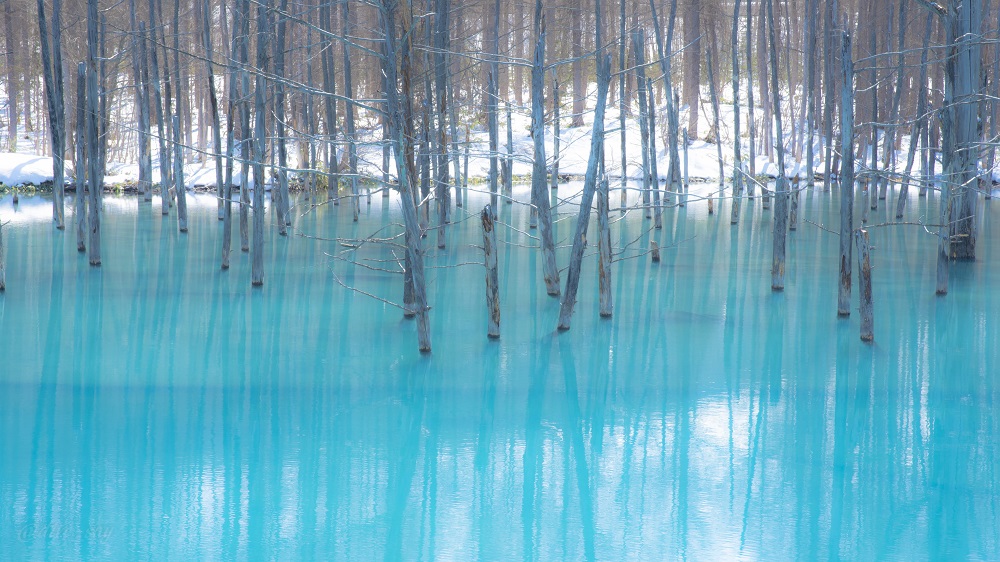 写真:弊社美瑛町オフィスのある北海道美瑛町の青い池の風景です。Photo by Toshiki Ueno