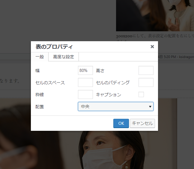 表のプロパティから、幅を80%にして、配置を中央にしました。